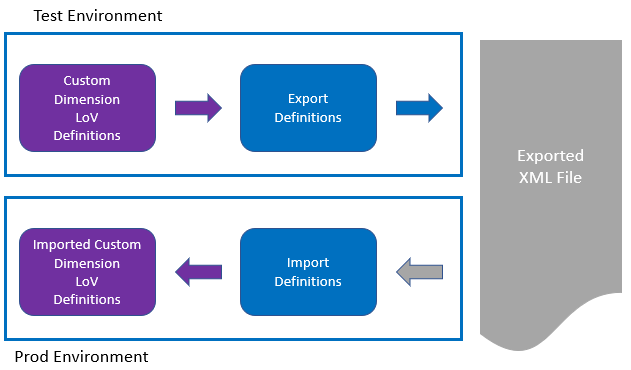 Custom Dimension LoV definitions can be exported from one environment and imported into another.
