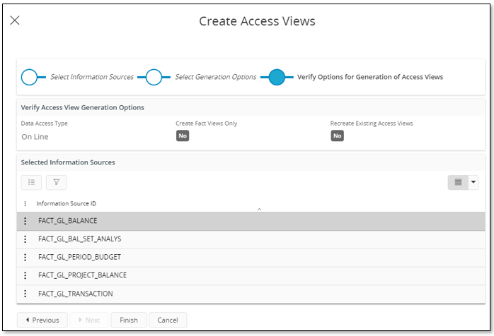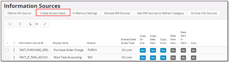 Access Views are views referencing corresponding Information Source views. The Access Views look the same independent whether they are based on On Line or Data Mart access. The views are used as the read interface in IFS Applications when extracting data to the SQL Server database.