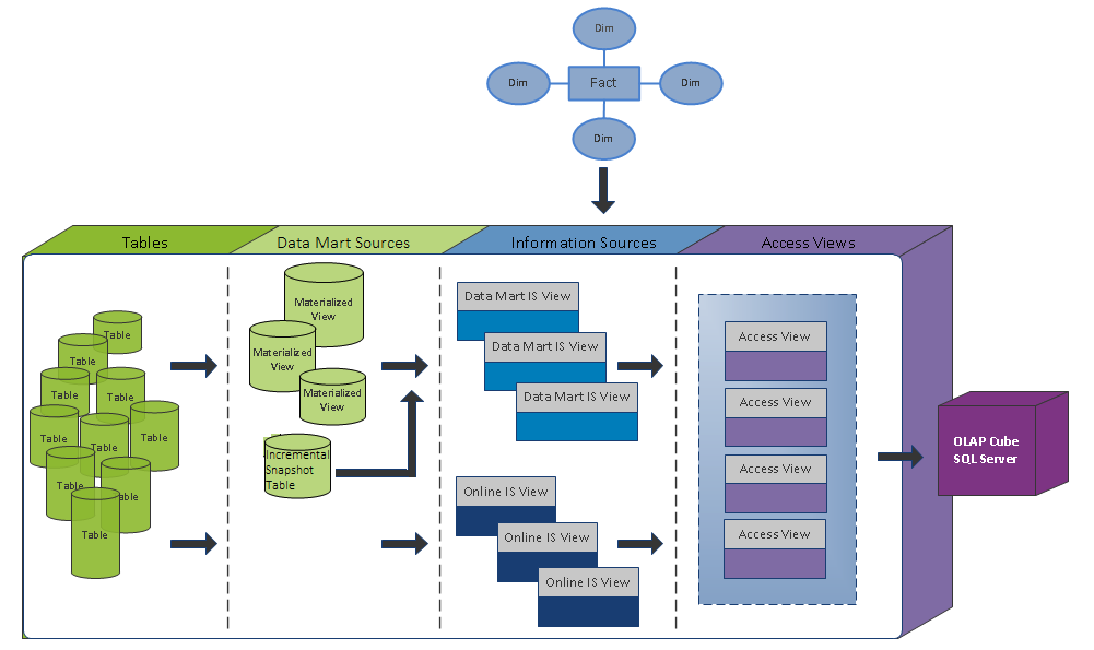 Note: Data Mart access is either based on Materialized Views or on incrementally loaded snapshot tables