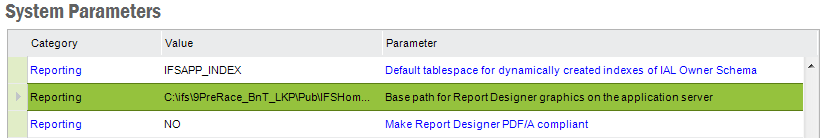 The folder defined using this setting should contain a stdlogo folder containing the standard ifslogbw.gif logotype. Note that even if this is defined in Base Server, it's actually Extended Server that reads and uses this path, so the folder specified here must be accessible from the Extended Server machine. Any report specific graphics needs to be copied to the same specified location, in this case the entire report folder structure: report_designer_graphics\<module_name>\<report_id> needs to be copied.