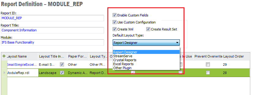 The Report Designer layout must be registered using the above form before it can be previewed or printed in runtime. The form body is where the new layouts are registered.